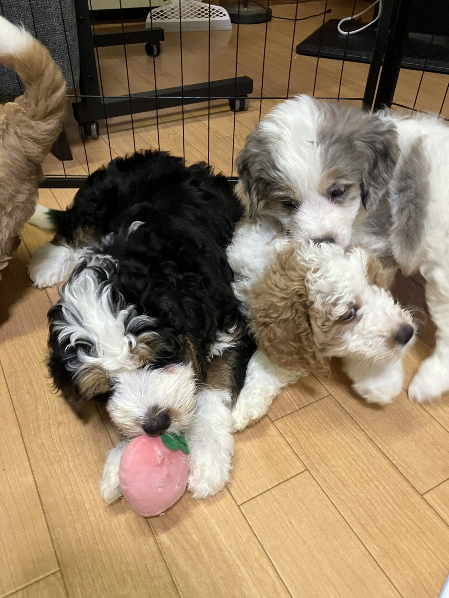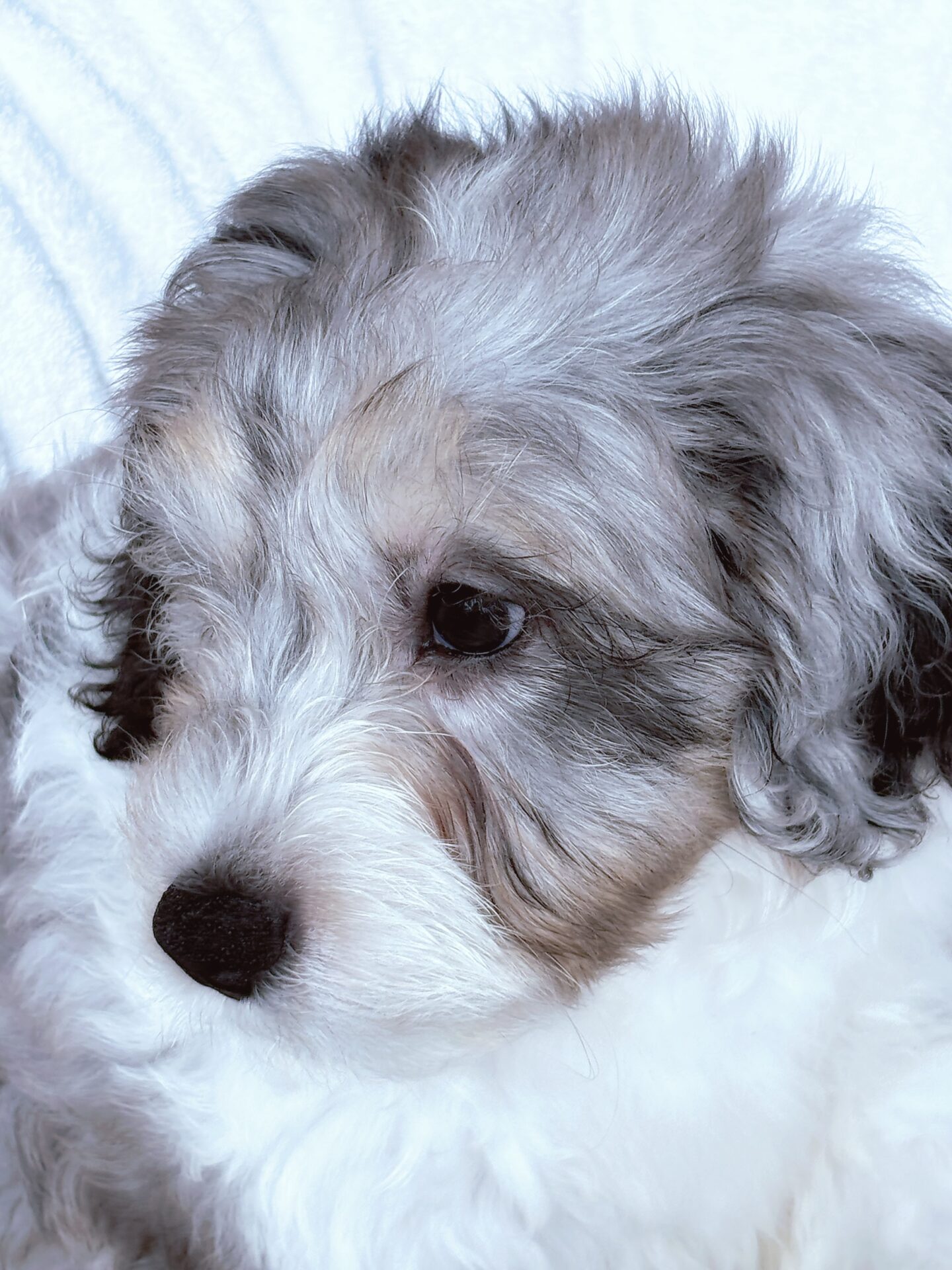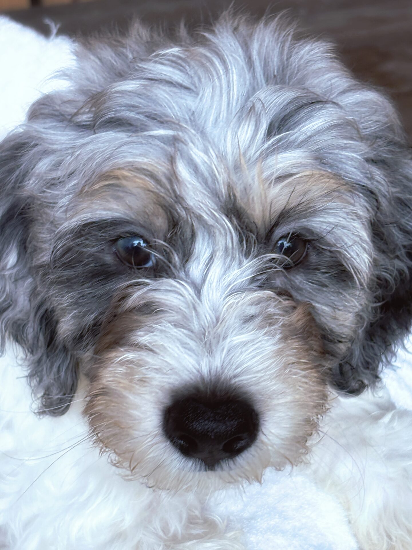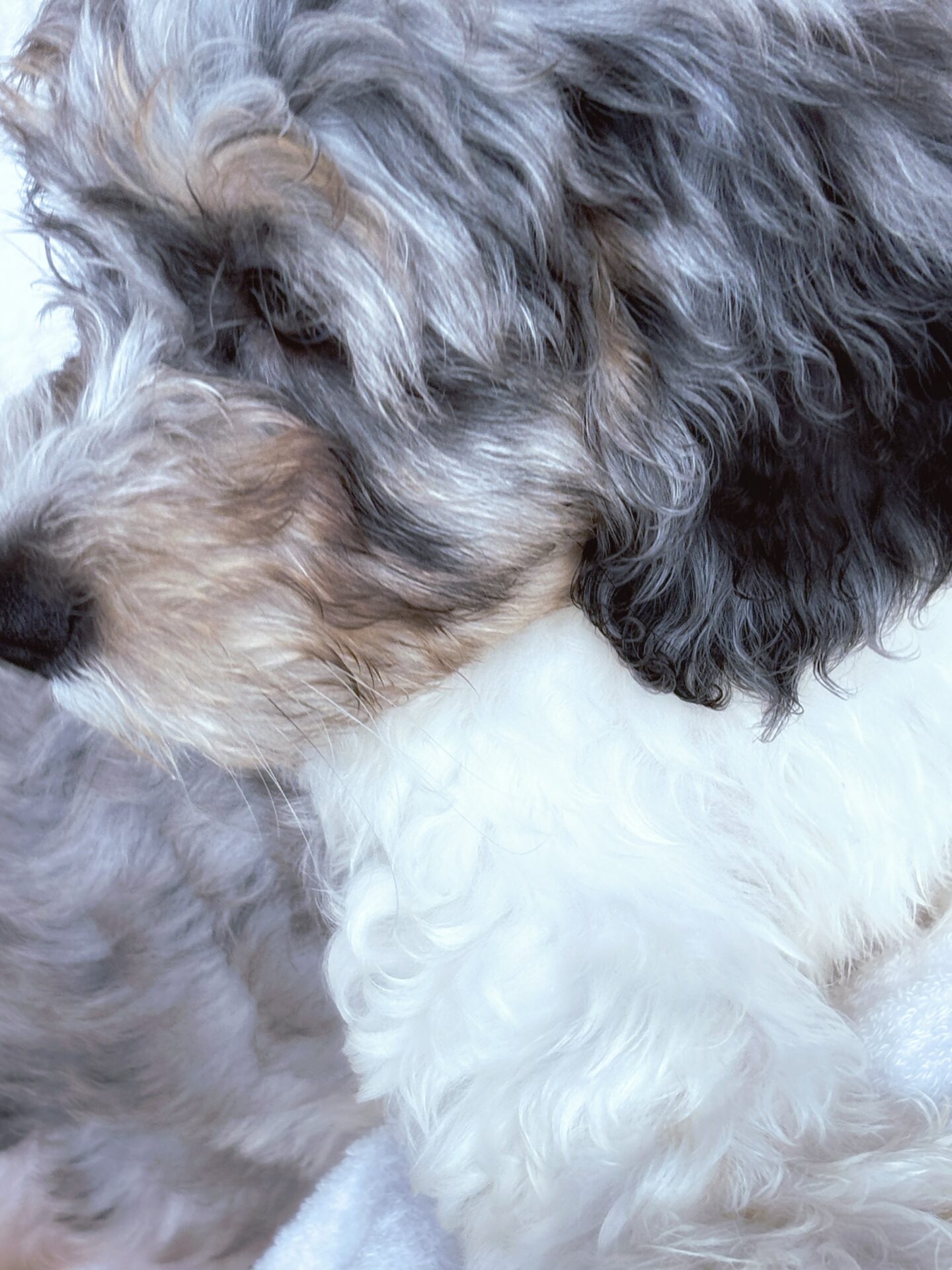 日本ではとても珍しい、ブルーマールのミニチュア・バーニードゥードルの男の子です。毛色は白・グレー・黒・茶色の美しいミックスで、成犬時の体重は15kg 前後を予想しています。