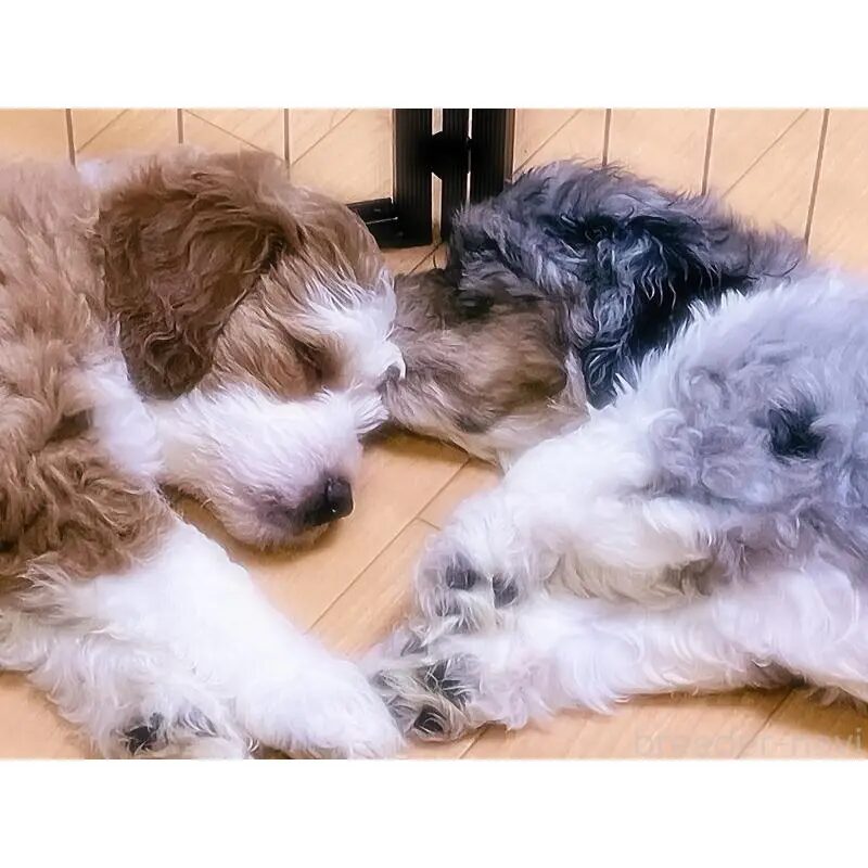 日本ではとても珍しい、ブルーマールのミニチュア・バーニードゥードルの男の子です。毛色は白・グレー・黒・茶色の美しいミックスで、成犬時の体重は15kg 前後を予想しています。